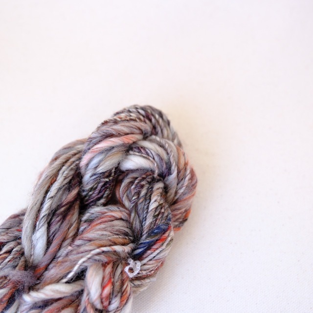 ふんわりとした極太の部分と キュッとしまった細い部分を交互に楽しめるスラブヤーンを アースカラーをメインに紡いでみました シンプルでありながら個性的な作品を作ることができます ■紡ぎ方:スラブヤーン ■重量:約43g ■素材:羊毛(コリデール / メリノウール) ■長さ:約24m ※大まかな目安のため多少の誤差があります ■注意点 ・手紡ぎのためひとつひとつ紡ぎ具合が違います 手紡ぎのならではの表情を楽しんでいただければ幸いです ・写真はできる限り実物の色がわかるように自然光の中で撮影をしておりますが お使いの機種や環境により色の見え方が変わる場合がございます あらかじめご了承ください ・できる限り乾燥させた状態で計量しておりますが、湿度により重さが数グラム変化することがあります ・アートヤーンは繊細な作りが特徴のひとつとなります。強く引っ張ったり擦ったりすると形が崩れてしまうのでご注意ください ・カットする際は細い部分をカットすると解れにくいです ・お洗濯はウール対応洗剤をご使用の上で優しく手洗いしてください ※お湯のご使用は変形の原因となりますのでご使用をお避け下さい ・こちらのアートヤーンはカセの状態でお届けさせていただきます