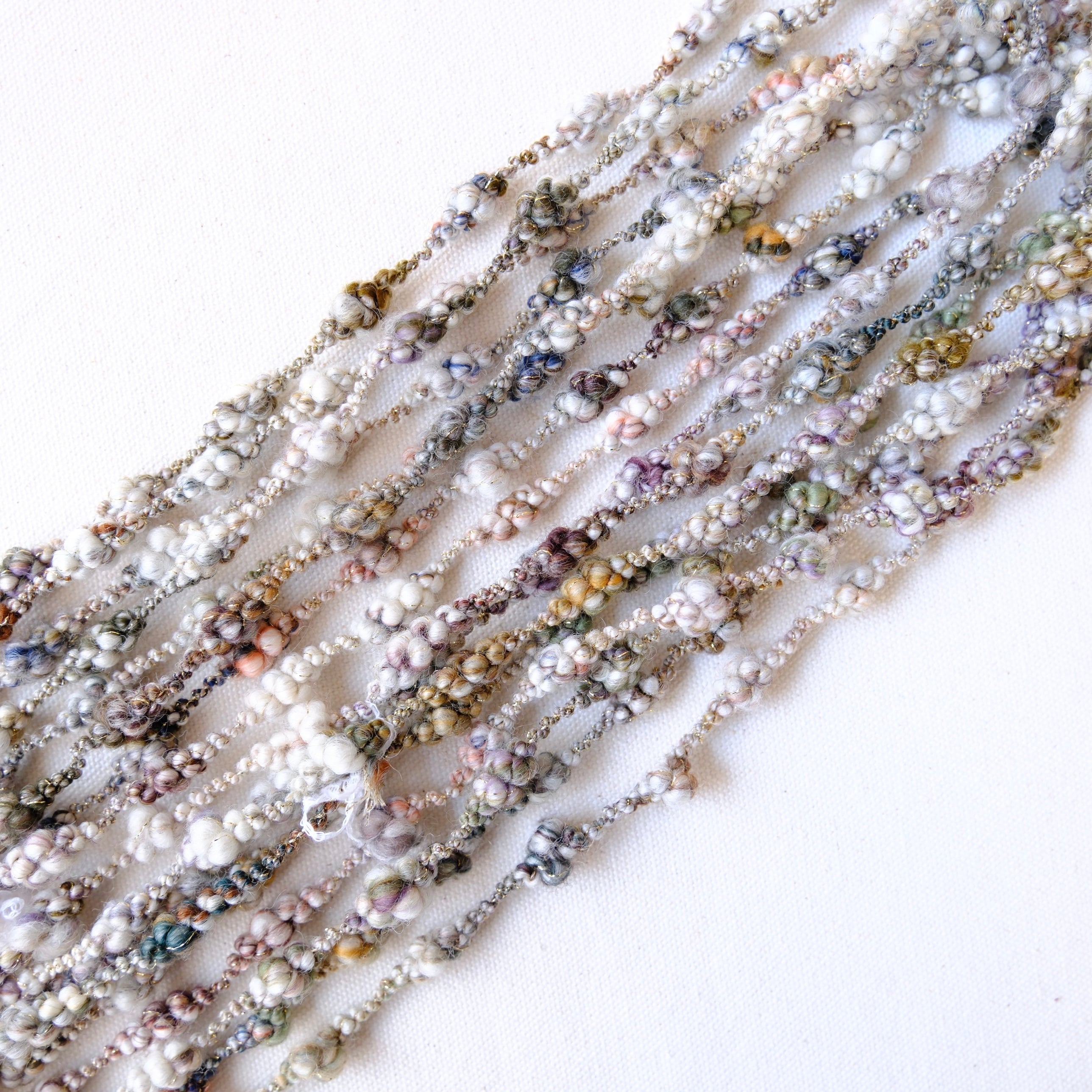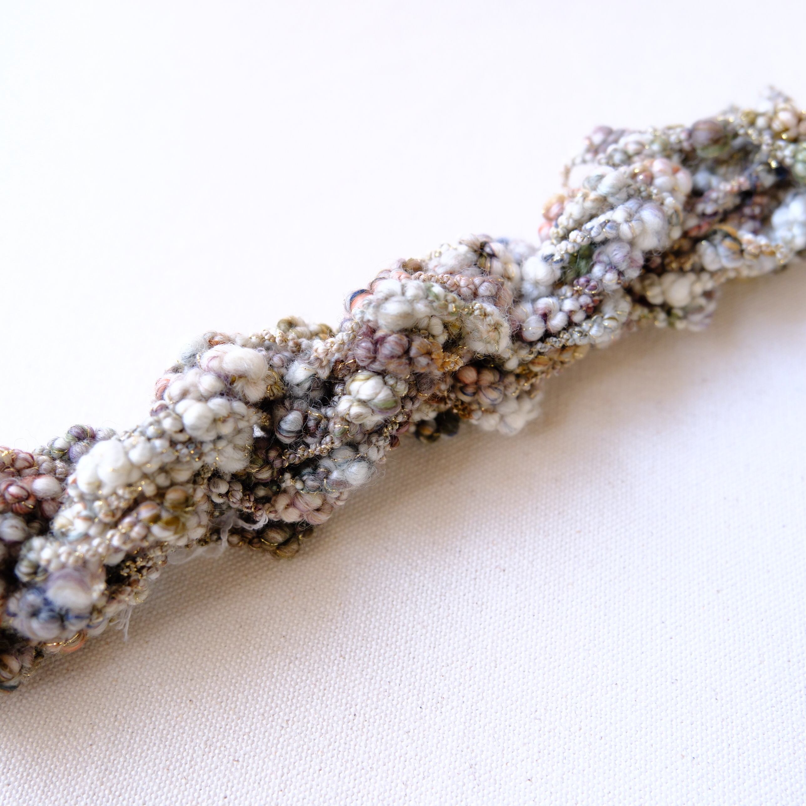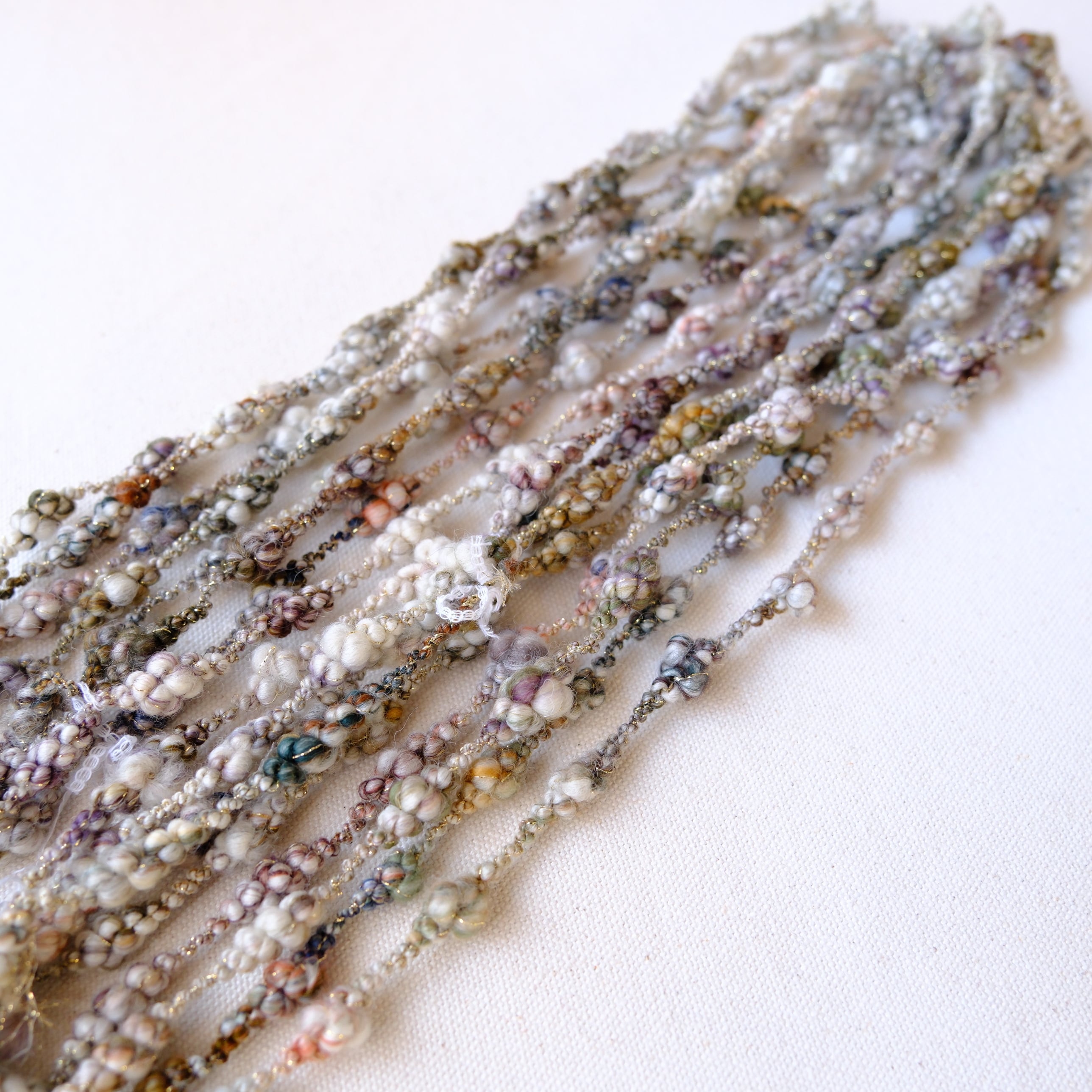 ・アートヤーンは繊細な作りが特徴のひとつとなります。強く引っ張ったり擦ったりすると形が崩れてしまうのでご注意ください